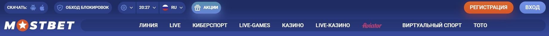 В верхней части интерфейса расположены кнопки «Вход» и «Регистрация», а также ссылки на разделы «Спорт», «Live», «Казино», «Киберспорт», «Тотализатор» и «Aviator».